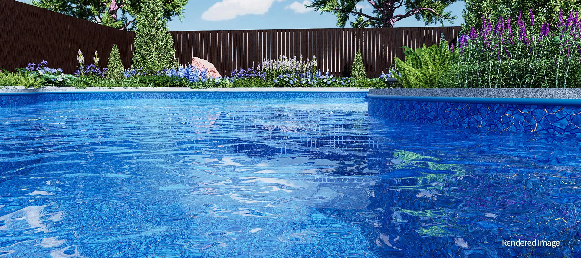 Unveil the timeless beauty of water and stone with our new Caspian print – a shimmering mosaic of classic blue stone, intricately inlaid with swirling spirals. Golden accents flow through the design like hidden treasure, catching the sunlight and evoking a sense of discovery and luxury. Printed on our HD Caribbean Blue base film, Caspian transforms your pool into a brilliant, medium-blue oasis reminiscent of once-in-a-lifetime destinations.
